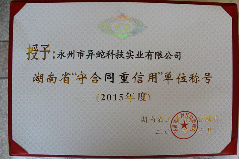 永州市异蛇科技实业有限公司荣获湖南省“守合同重信用”单位称号