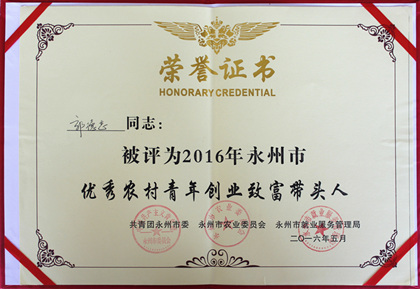 永州市优秀农村青年创业致富带头人荣誉证书 5月4日下午,永州市纪念“五四”运动九十...
