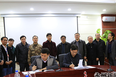 (签约仪式现场 陈斌 摄)(永州异蛇科技公司总经理郭德志、科技学院副校长宋宏福在仪...