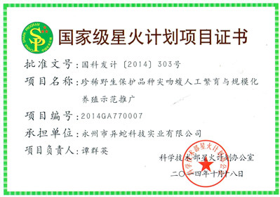 异蛇科技《珍稀野生保护动物品种尖吻蝮人工繁育与规模化养殖示范推广》项目被列入国家级星火计划